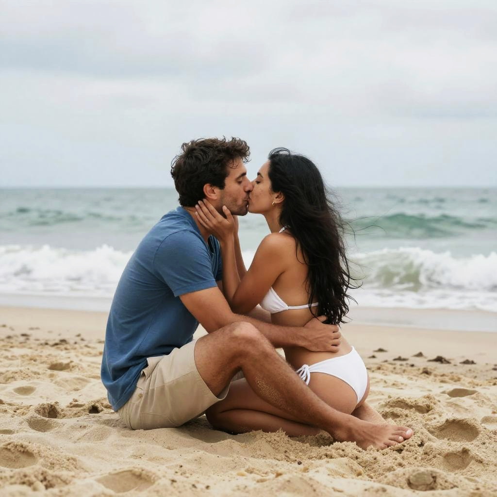 Photograph of a romantic beach scene featuring a blonde woman and a dark-haired man kissing. The woman, with wavy, shoulder-length hair, wears a black tank top and black shorts, her right leg playfully lifted. The man, with short, dark hair, wears a white t-shirt and black pants. They are embracing tightly, with the man's left hand on her back and his right arm around her waist. The background shows a blurry, overcast sky and gentle ocean waves. The image has a vibrant, natural color palette and captures the couple's intimate moment against the serene beach setting.