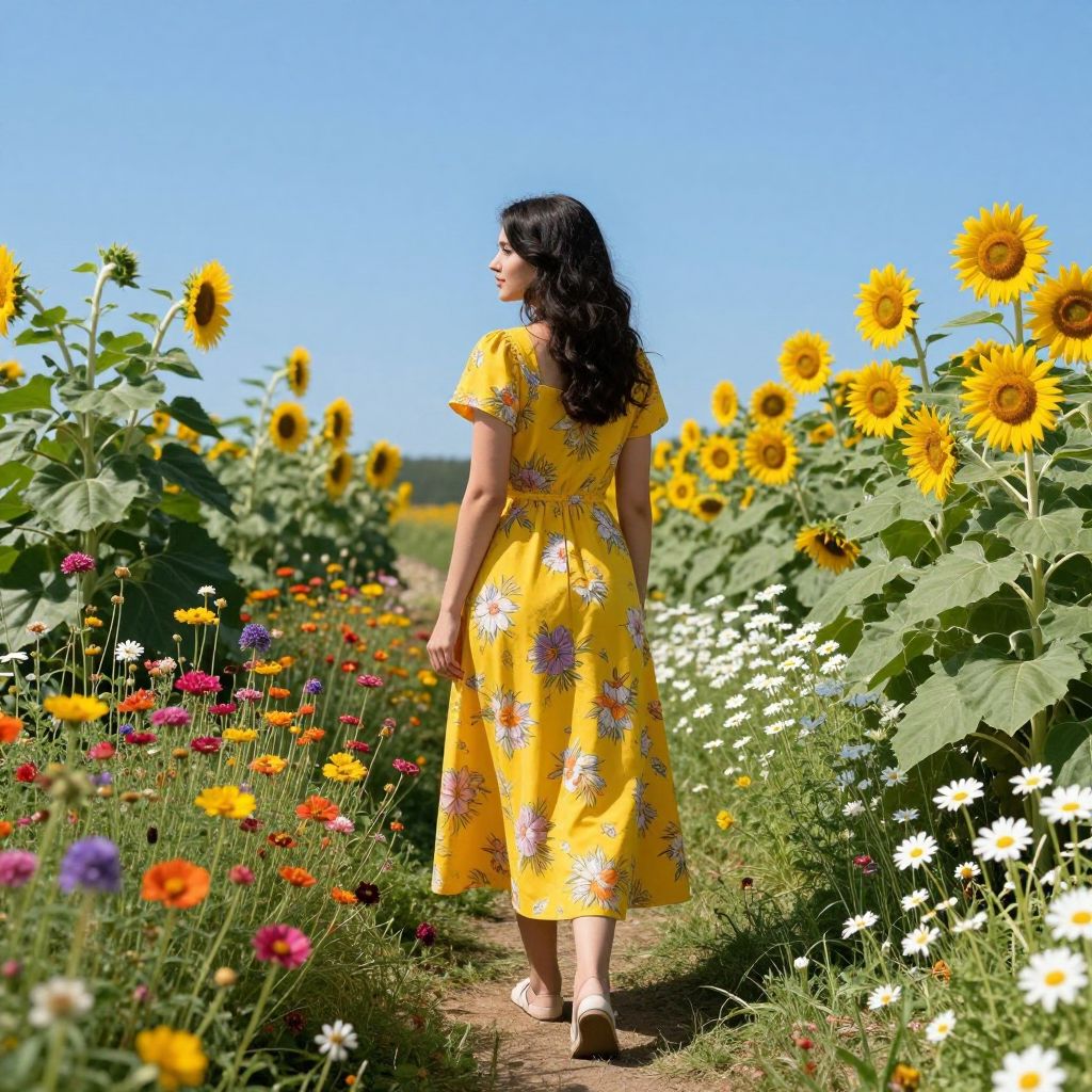 Woman in a vibrant yellow floral dress stands amidst a lush garden of colorful wildflowers, her back turned as she gazes toward a pathway lined with sunflowers and daisies under a clear blue sky.