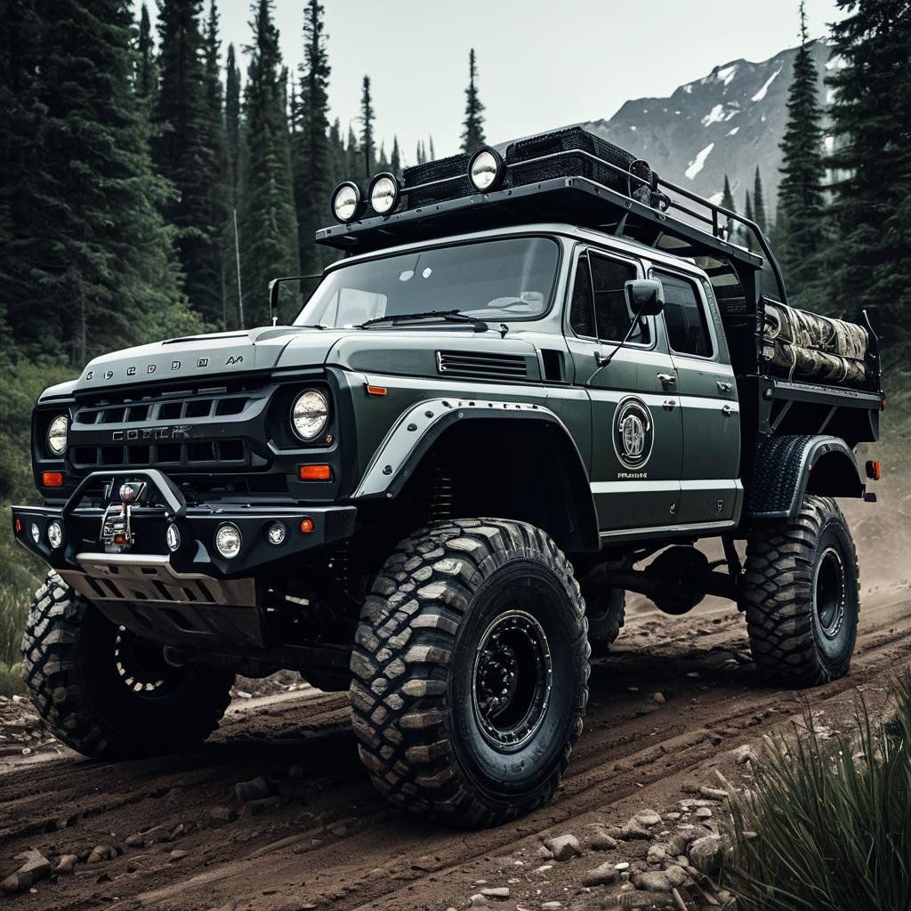 Highly detailed off-road truck with rugged tires and roof-mounted lights driving on a rocky mountain trail surrounded by dense pine trees. The vehicle features a robust design with a winch on the front bumper and outdoor gear in the truck bed, set against a backdrop of tall forest and snow-capped mountains, captured in sharp, concept art style.