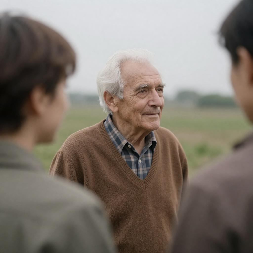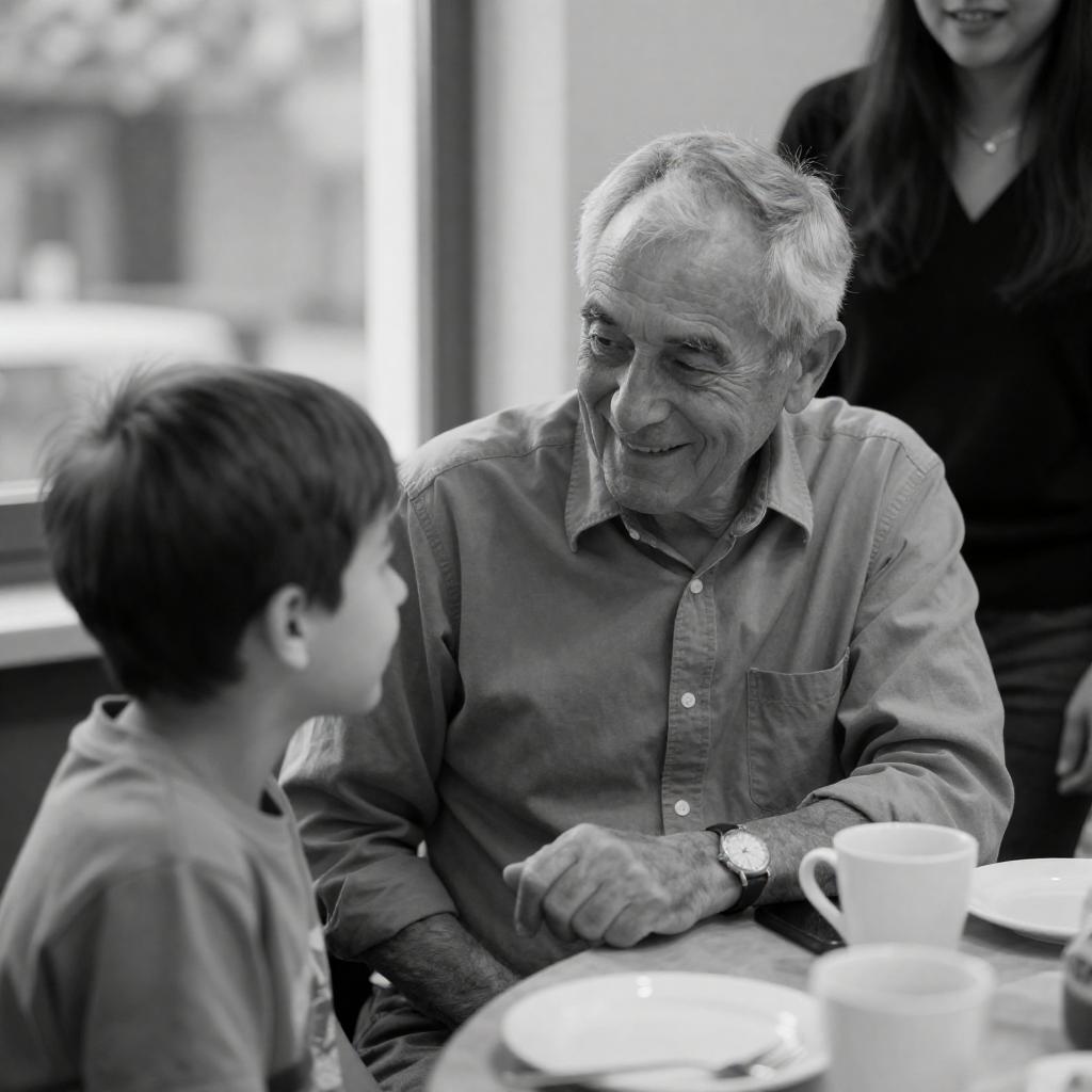 Black-and-white photograph of an elderly man with short, gray hair, wearing a button-up shirt, smiling as he interacts with a young boy with short hair, seated at a table. A woman with long hair, partially visible, stands behind them. The table holds cups and plates. The background shows a window with light filtering through.