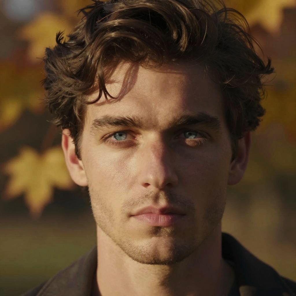 Close-up portrait of a handsome blue eyes man with tousled dark hair, slight stubble, intense gaze, soft shadows enhancing facial features, warm golden hour lighting, blurred nature background with autumn leaves and soft bokeh.