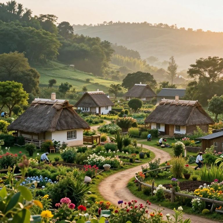 Village nestled in a lush green valley at sunrise, quaint cottages with thatched roofs, winding dirt paths, villagers tending to gardens, colorful flowers blooming, haze in the distance, peaceful and serene atmosphere, soft warm lighting, detailed nature elements.
