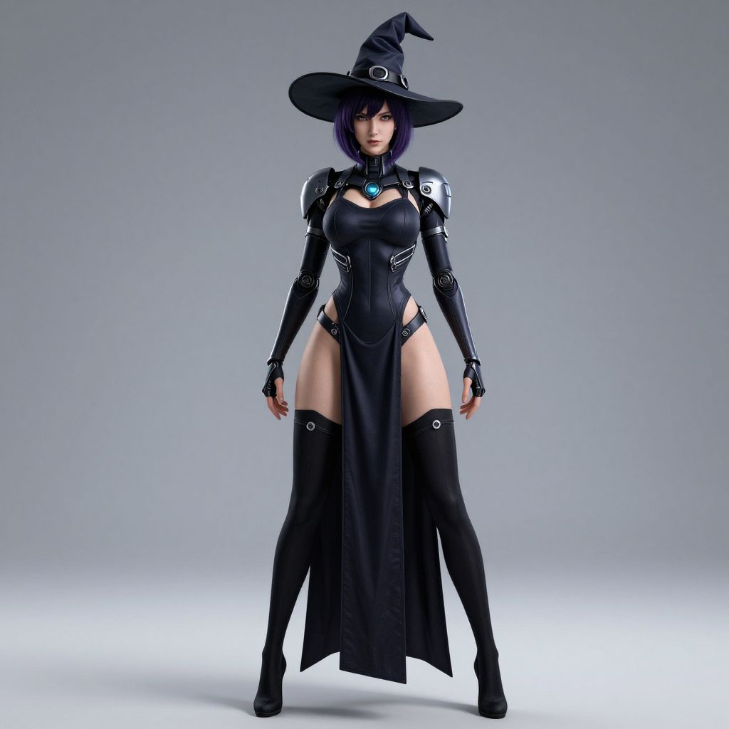 CGI image of a striking, dark-haired woman in a black, form-fitting witch costume. She wears a wide-brimmed, pointed hat with a curled tip, and her outfit includes a high-collared, armored chest piece, long sleeves, and thigh-high boots with high-cut sides revealing her hips. The costume has intricate silver accents on the shoulders and arms. She stands confidently against a gradient gray background, her expression stern and her posture assertive. The lighting highlights her pale skin and the glossy texture of her outfit. The overall style is futuristic and fantasy-inspired.