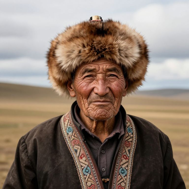 Portrait of a Kalmyk elder with traditional fur hat and embroidered garments, set against a backdrop of rolling steppes and cloudy sky, emphasizing deep wrinkles, wise expression, and cultural heritage in warm earthy tones and realistic lighting.