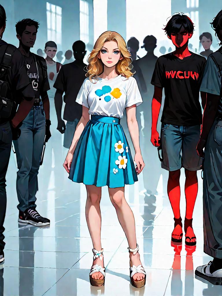Full body shot of a young woman with blonde hair and fair skin, wearing a white fitted crew-neck T-shirt and a high-waisted, navy blue mini skirt with yellow and white daisy print and a flared silhouette. She is also wearing tan platform sandals with ankle straps. The background is a bright, neutral indoor setting with blurred people around her.