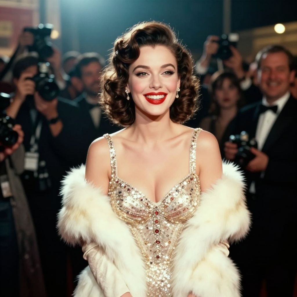 MichelleD_SoloTI_v1, PA7_Portrait-ECU, (happy, smile:1.3), (Dressed in a glamorous gown with sequin embellishments and fur stole, styled with vintage curls and bold red lipstick), (Amidst the glitz and glamour of a 1950s Hollywood movie premiere, with photographers flashing and crowds buzzing with excitement:1.3), (seductive:1.3), (analog, cinematic, film grain, hazy atmosphere, cinematic shot:1.3)
