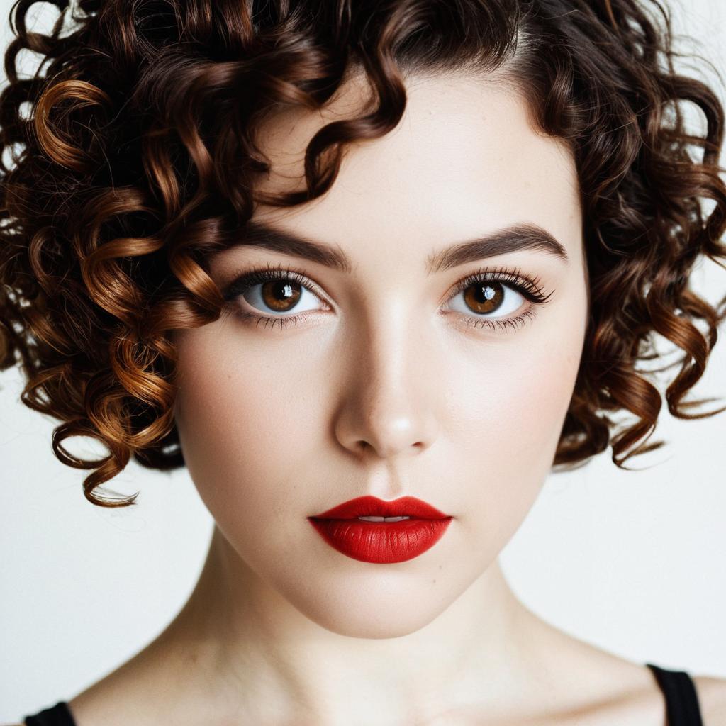 Close-up, portrait, 1girl, solo, vivacious young lady radiating charm with short asymmetrical curls, red lips, lipstick, makeup, focus on lips anatomy, detailed expressive eyes, rich skin texture, bright hazel specked with amber, asymmetrical curly bob, rich chestnut brown, white background