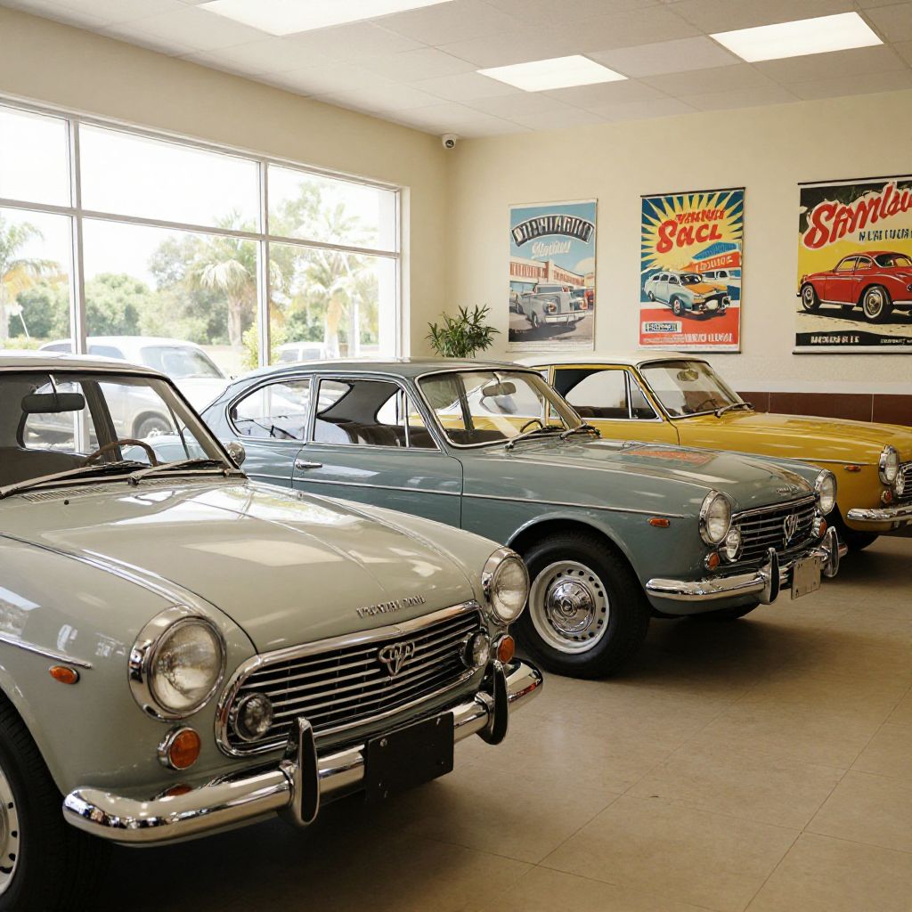 Photograph of a vintage car showroom with three classic cars (gray, blue, yellow) under bright fluorescent lights, featuring retro car posters on the cream