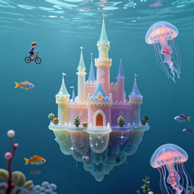 Digital artwork of a glowing, floating castle surrounded by jellyfish, fish, and a child on a bicycle underwater. Vibrant colors, whimsical fantasy