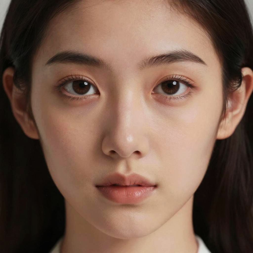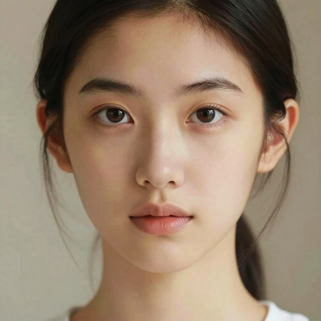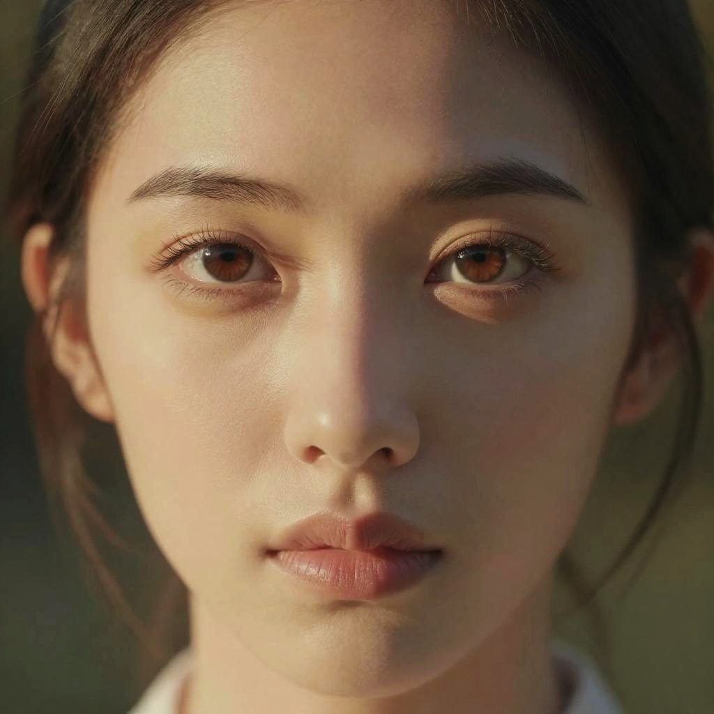 Photograph of a young Asian woman with fair skin and dark brown eyes. She has dark brown hair pulled back, revealing her clear, smooth skin and subtle natural makeup. Her eyebrows are neatly groomed, and her lips are slightly parted with a natural pink hue. The background is blurred and dark, keeping the focus on her face. She wears a white top, and the lighting highlights her facial features, giving a soft, realistic texture to the image. The photograph emphasizes her calm, neutral expression.