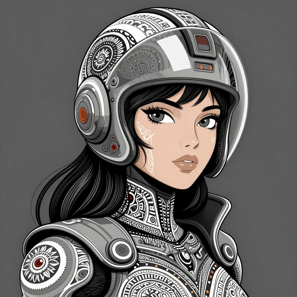 Digital drawing of an Asian woman with pale skin and black hair, wearing a detailed, futuristic silver helmet with red and white accents, and a high-tech, patterned armor suit. Her expression is calm, with slightly parted lips and large, almond-shaped eyes. The background is a solid dark gray. The armor and helmet feature intricate, mechanical designs with gears, circuits, and symbols. The style is reminiscent of cyberpunk art, with sharp lines and a monochromatic color scheme. The image focuses on her upper body, showcasing the elaborate design of her headgear and attire.