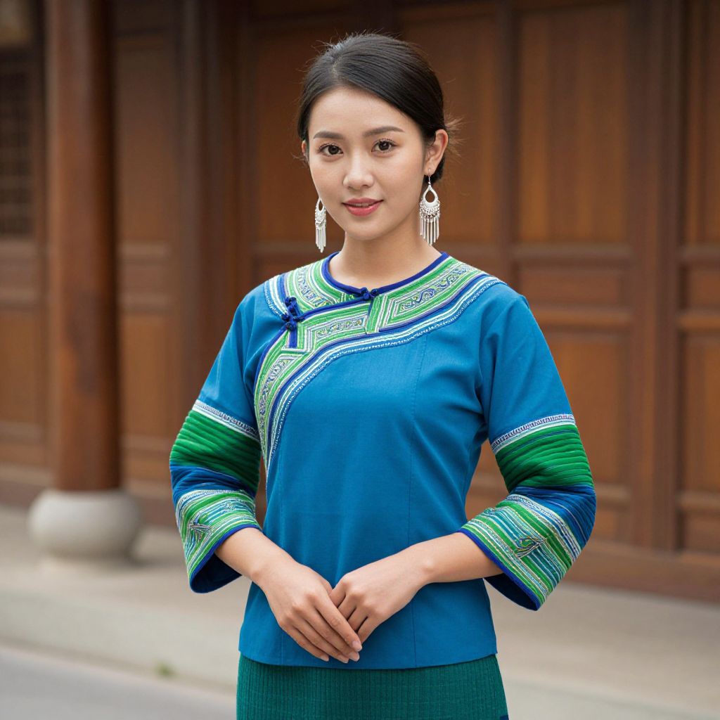 Photograph of an Asian woman with black hair in a blue traditional top with green and white patterns, standing against a wooden building. She wears long,