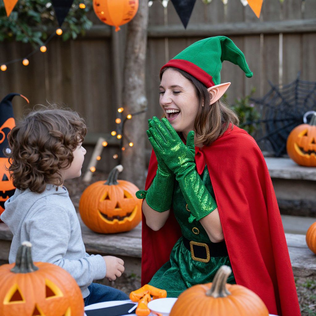 A bright-eyed 9-year-old boy with curly dark hair and a bright red nose, confidently posing in a he boy costume featuring a green tunic, white gloves, and a golden crown, standing in front of a brightly decorated birthday party tent with balloons and streamers floating in a suburban backyard.