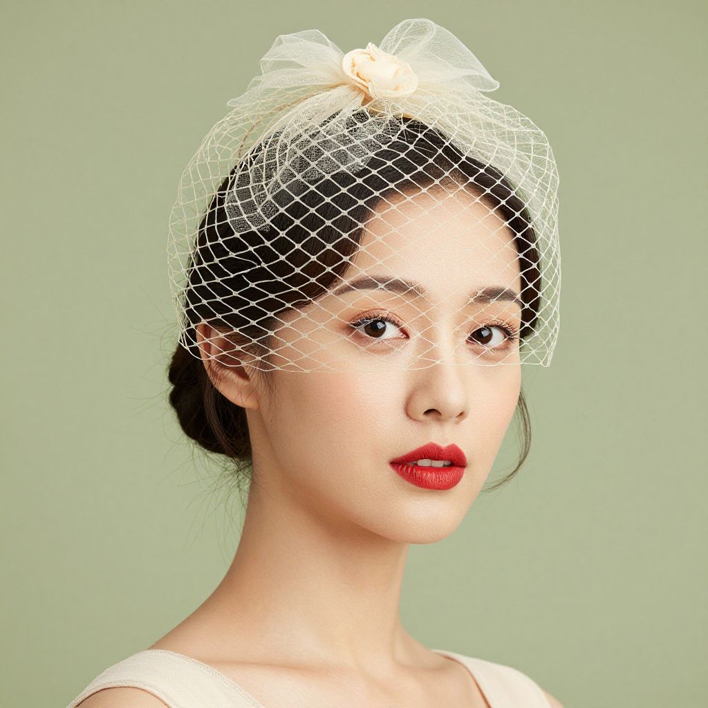 Elegant ivory tulle birdcage veil adorned with a delicate matching rosette fascinator gracefully frames the head of a woman, complementing her poised expression and vibrant red lipstick against a soft green backdrop.