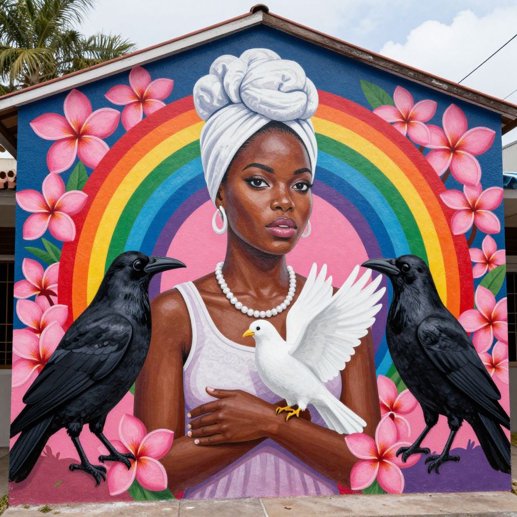 A vibrant outdoor mural featuring a Black woman adorned in a white head wrap, surrounded by a rainbow arc, flanked by ravens, and cradling a white dove, all set against a backdrop of lush pink plumeria flowers, rendered in bold, vivid colors with a striking digital art style.