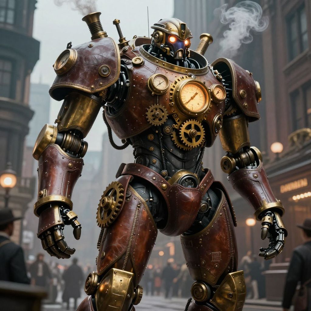 Steampunk mech suit towering in a bustling Victorian city, intricate brass gears, steam exhausts, glowing gauges, detailed leather panels, dynamic lighting, cinematic atmosphere