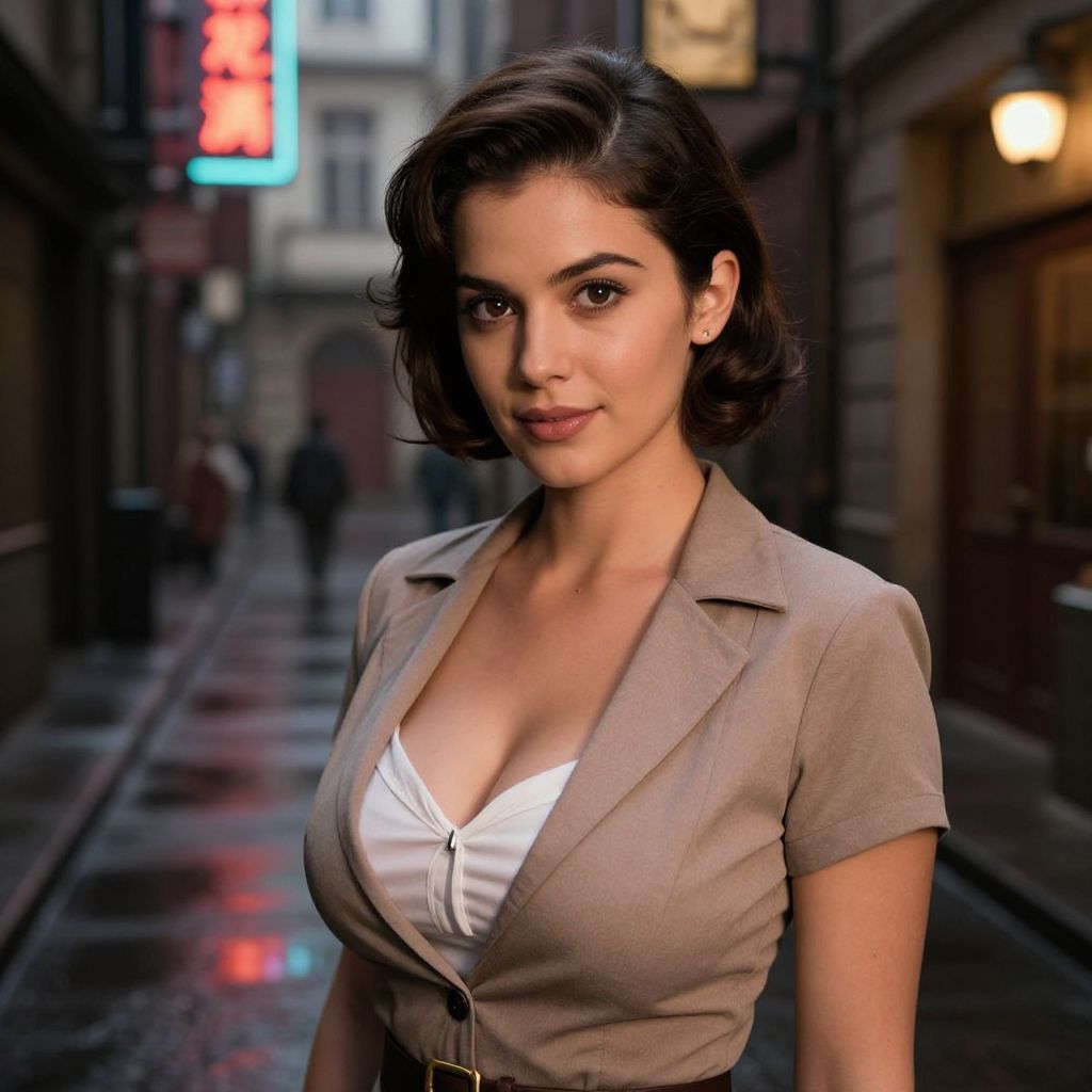 A young woman with a sharp, lady short hairstyle wearing a vintage 1940s detective costume, standing in a dimly lit old-fashioned city alley with neon signs reflecting on wet pavement, her face has a determined yet warm expression with defined cheekbones and soft brown eyes.. The woman has big breasts and cute face