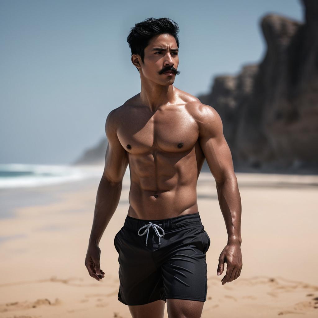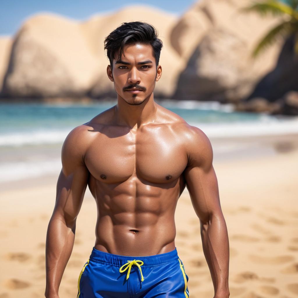 A muscular young man with short black hair and a trimmed mustache and beard is walking confidently along a sandy beach. He is shirtless, wearing blue swim trunks with palm leaf prints. The beach has gentle waves and some greenery in the background under clear skies.