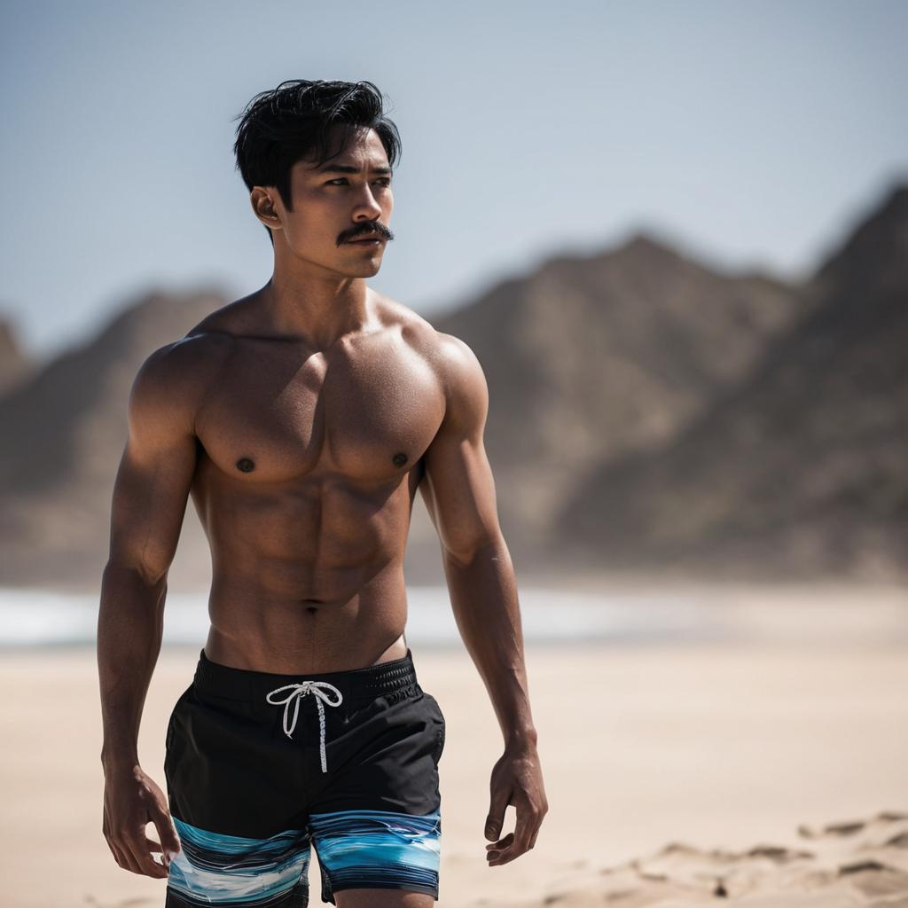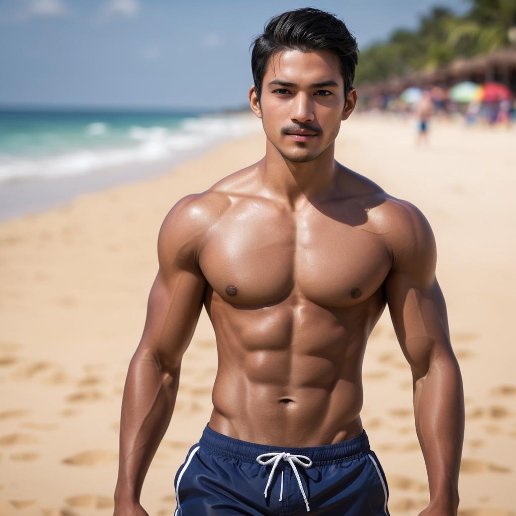 1boy, male focus, solo, realistic, beach, facial hair, topless male, outdoors, black hair, navel, dark-skinned male, swim trunks, male swimwear, shorts, blurry background, sand, dark skin, asian, abs, blurry, day, looking at viewer, mustache, pectorals, nipples