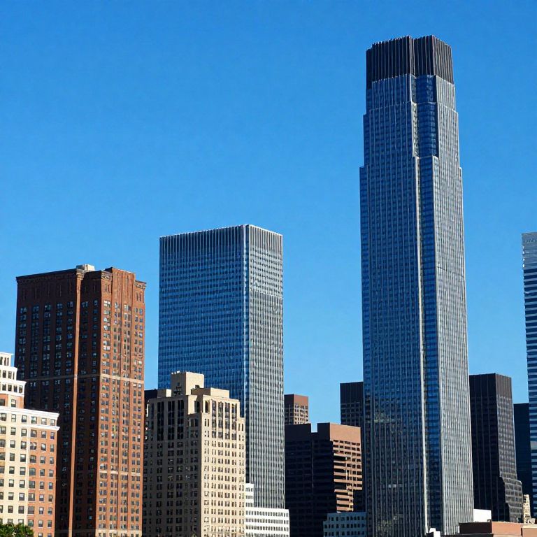 This is a digital composite of a city skyline with a bright blue sky. The tallest building on the right is a sleek, modern skyscraper with a dark glass facade, while the rest of the buildings are shorter, with a mix of brick and glass structures. The overall style is sharp and slightly pixelated, giving it a modern, almost graphic novel look.