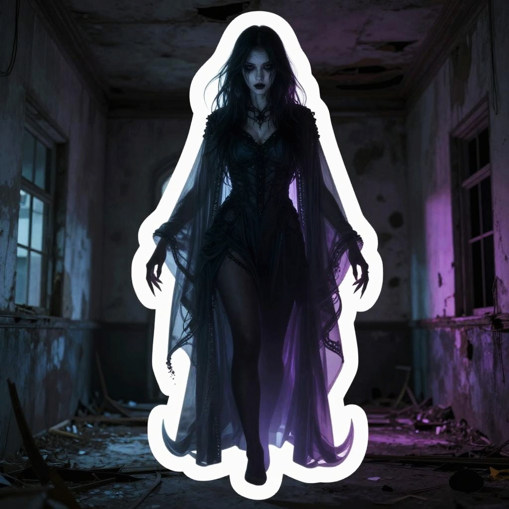 Realistic photo.Die cut sticker. beautiful female specter, abandoned asylum, demonic, vaporwave, retro, neon, aesthetic, high quality, high definition, beautiful, dramatic lighting realistic photo