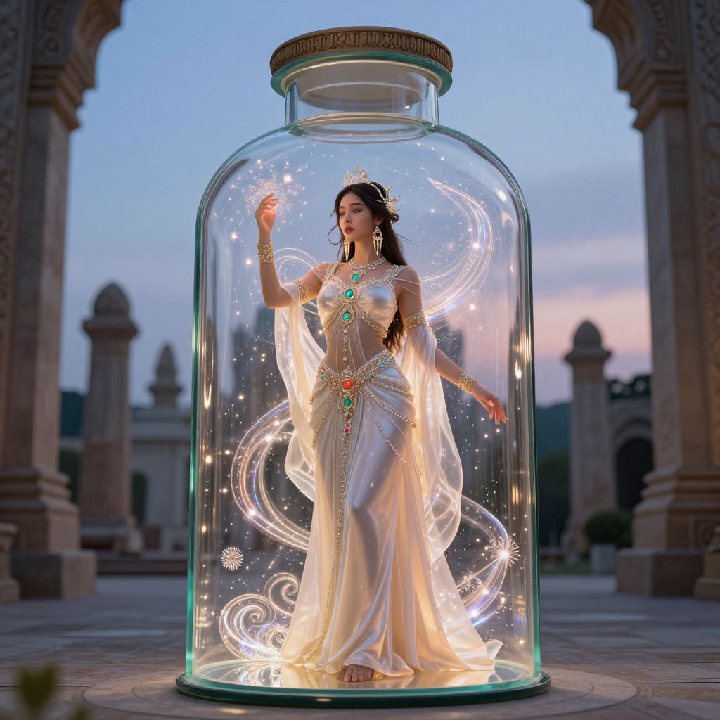 Female genie in a bottle, elegant flowing robes with jeweled accents, surrounded by sparkling magical aura, ancient mystical ruins in twilight, detailed glass reflections