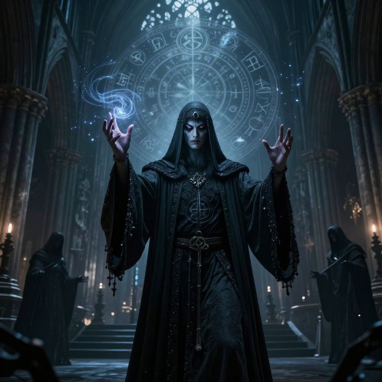 Fantasy:zwxo-jvilg4= -- a dark fantasy setting depicting a mysterious sorcerer casting powerful spells in a gothic cathedral filled with arcane symbols, swirling magical energy, and shadowy figures lurking in the background, highly detailed with moody lighting