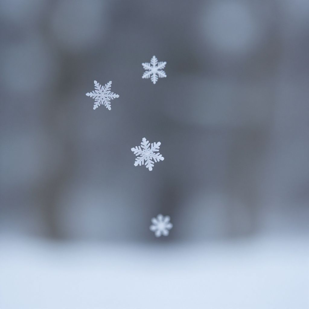 Photograph of three white snowflakes floating in a blurred, blue-gray winter background, with a soft, icy texture.