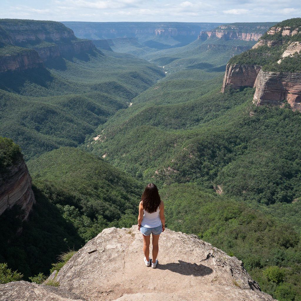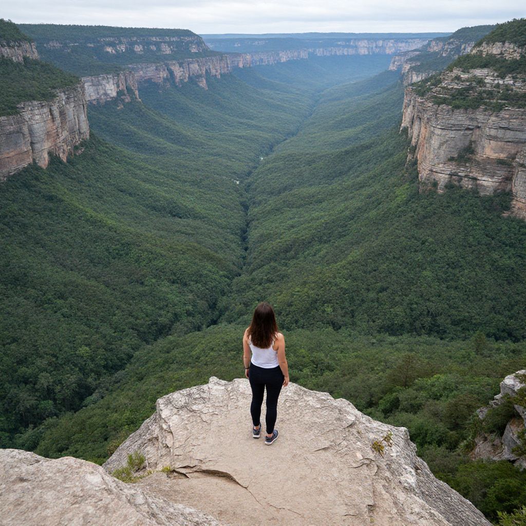 Photograph of a young woman with long dark hair, wearing a white sleeveless top and black pants, standing on a rocky cliff overlooking a vast, lush green valley. The valley is densely forested with layers of green trees, framed by steep, rocky cliffs on either side. The sky above is overcast, casting a soft light over the landscape. The rocky cliff edge she stands on is light grey and textured. The perspective is from behind her, highlighting the expansive, natural beauty of the canyon below.