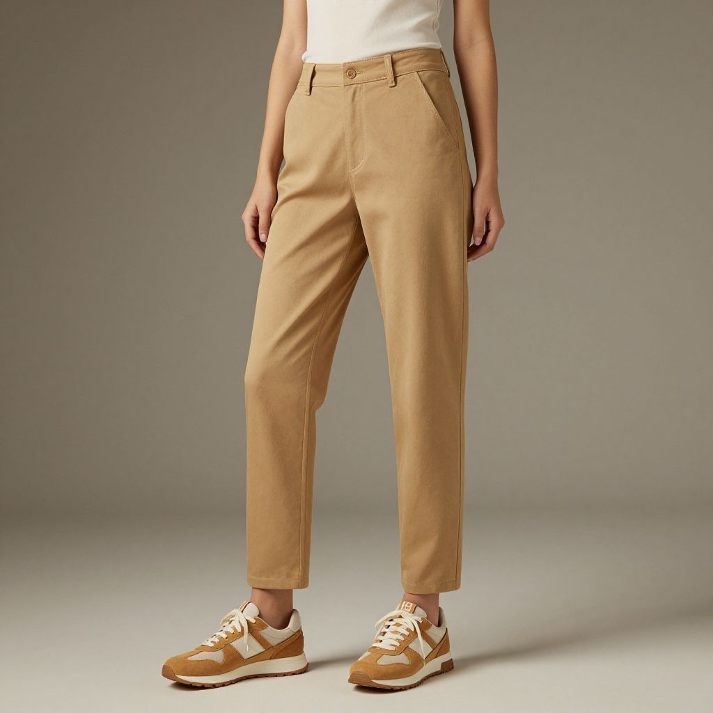 Female model wearing a beige tank top and tan pants with a pair of tan sneakers.