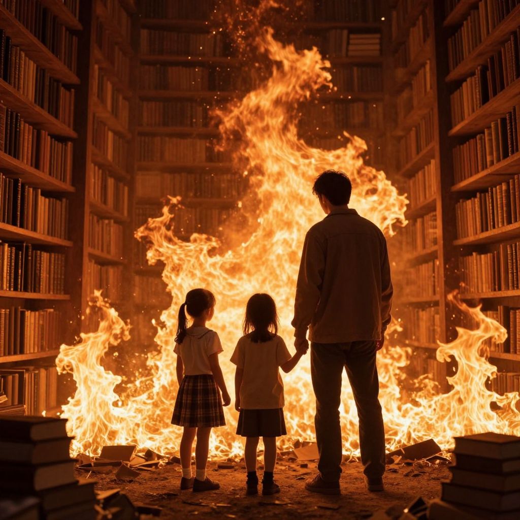 In a surreal library engulfed by flames, a man and child stand hand-in-hand, their figures illuminated by the inferno as they face a world where knowledge burns, yet hope persists.