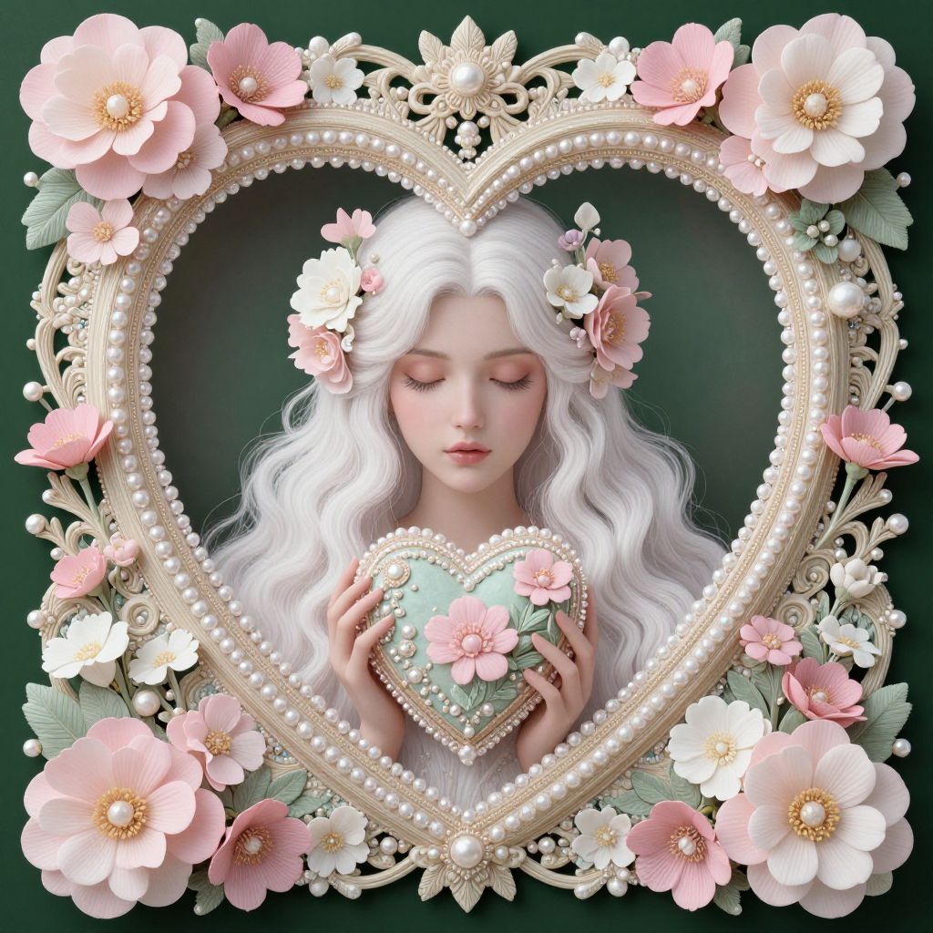 The image is a highly detailed, ultra-detailed fantasy illustration featuring pastel colors and delicate sweet tones. The central figure is a woman with long, flowing white hair adorned with pink and white flowers. She holds a small, heart-shaped object in her hand, which is also adorned with flowers and pearls. The heart is surrounded by a heart-shaped frame, intricately decorated with floral patterns and pearls. The background is a deep green, creating a contrast that highlights the pastel colors of the woman and the heart. The overall composition is symmetrical, with the heart and the woman's face aligned centrally. The image has a dreamy, ethereal quality, reminiscent of the styles of artists like Emile Vernon, Nadja Baxter, Anne Stokes, and Nancy Noel. The textures are rich and varied, from the smooth skin of the woman to the delicate petals of the flowers and the intricate patterns on the heart. The spatial relationships are well-defined, with the heart and the woman's face being the focal points, surrounded by the floral frame and the deep green background.