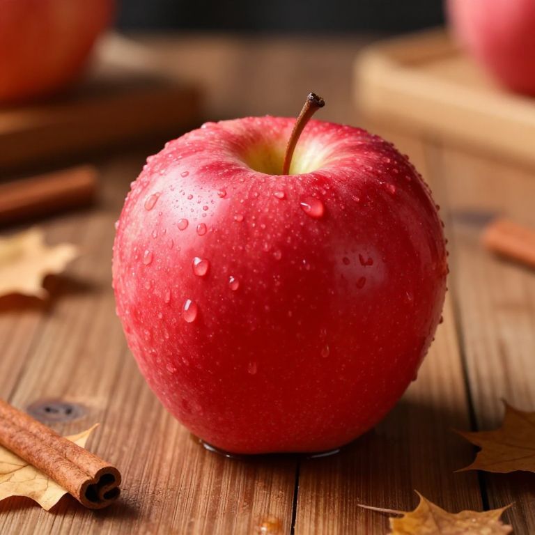 Chubby red apple on a rustic wooden table, glistening with droplets of water, natural light highlighting its roundness and vibrant color, cozy kitchen setting with scattered autumn leaves and cinnamon sticks