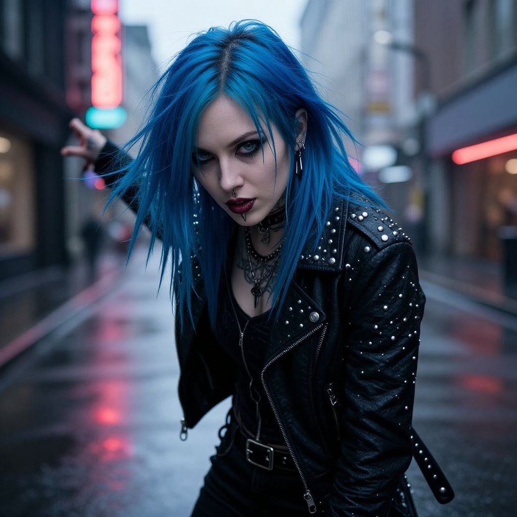 Photograph of a pale-skinned, young woman with dark, straight, shoulder-length hair featuring red highlights. She has striking blue eyes accentuated with heavy black eyeliner and dark eyeshadow. Her makeup includes bold, dark purple lipstick. She wears a black leather jacket with visible zippers and multiple piercings: a septum ring, small earrings, and a hoop earring in her right ear. The background is a solid, muted gray, which contrasts with her dark attire and makeup. Her expression is neutral, with a slight, enigmatic gaze directed slightly to the right. The image has a high-contrast, gothic style.