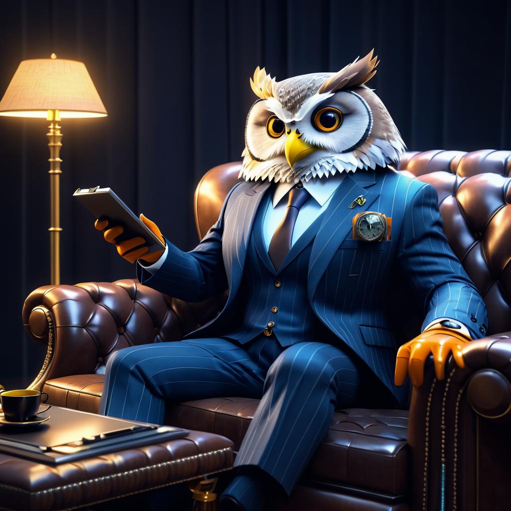 Anthropomorphic owl in a suit doing business on a detailed couch. Studio lighting, 8K resolution, trending on ArtStation, video game art style.