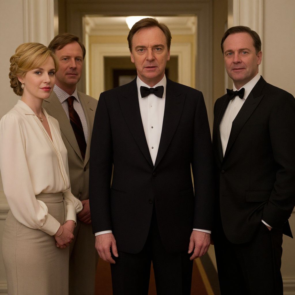 Colin Firth, portraying Harry Hart (\"Galahad\"), stands in a formal setting wearing a black tuxedo with a bow tie, framed by three other individuals in elegant attire, including a woman in a cream blouse and two men in suits—one in tan and another in black—within a warmly lit interior hallway.
