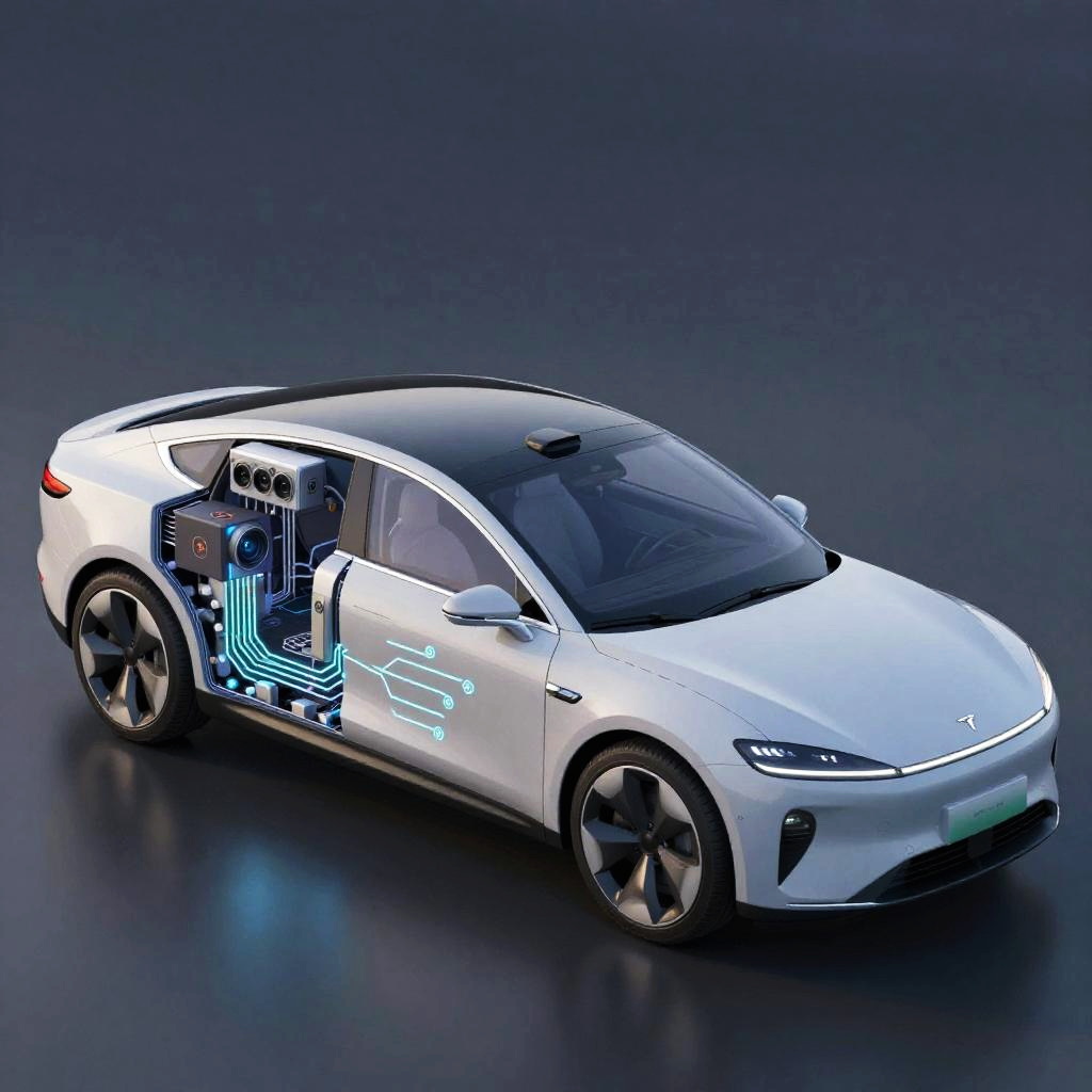 Cross-section view of a Car AI-enabled electric vehicle showing AI components like sensors, cameras, and processors integrated into the car’s body, with glowing electric circuits and a sleek aerodynamic shape, rendered in detailed technical illustration style.