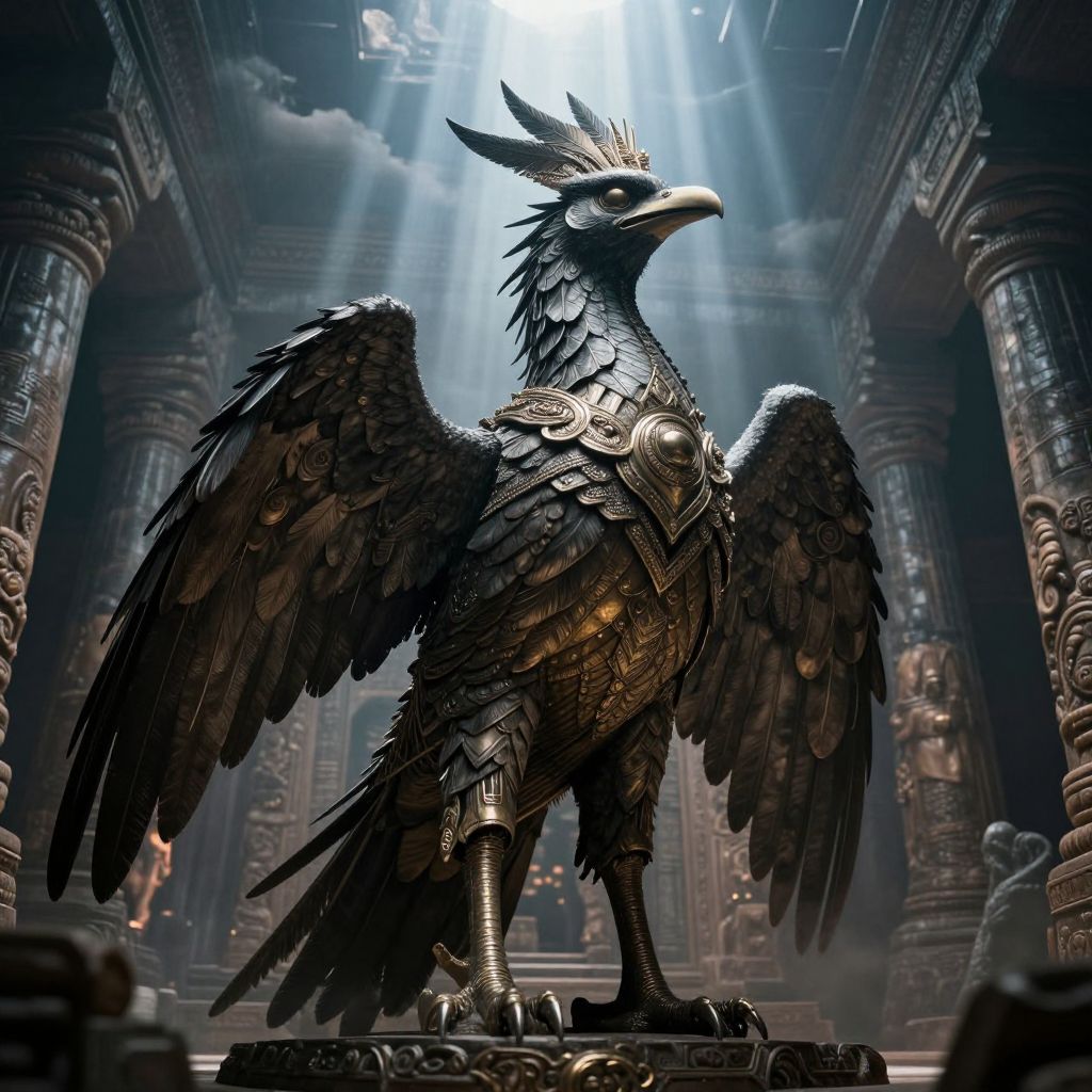 Surreal depiction of cheubim as a hybrid of bird and human, intricate armor made of feathers and metals, ancient temple backdrop with mystical light beams piercing through clouds, cinematic and dramatic mood