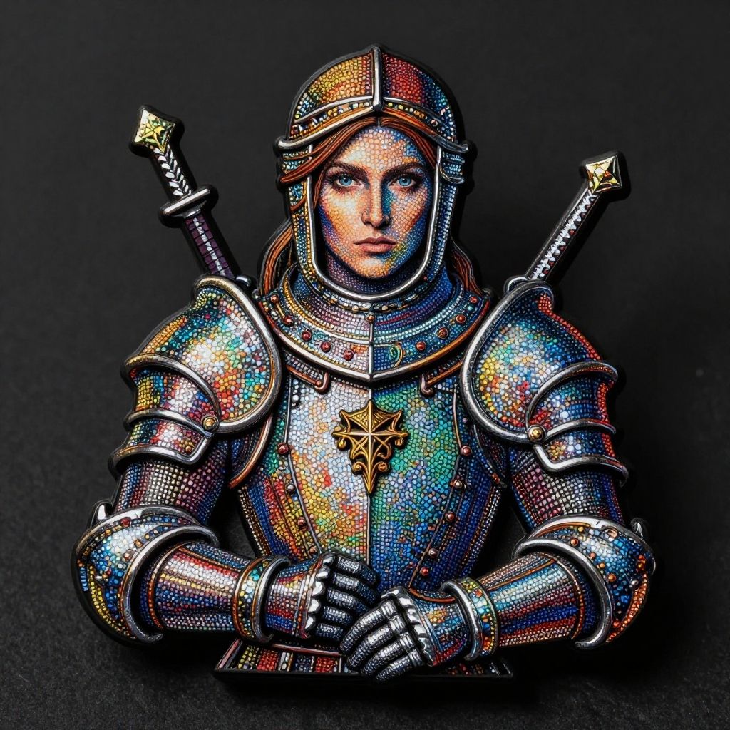 Line art trinket depicting a Femeref Knight Jindrich Styrsky, natural, shimmering, vibrant, gothic, rpg, 1400ad, ultra detailed, detailed, immersive, reminiscent of high fantasy RPG games, HD, masterpiece, best quality, hyper detailed, super realistic, perfect face, perfect hands, award-winning, professional, breathtaking, linquiverapassable Plainchilly weatherpointillism style . composed entirely of small, distinct dots of color