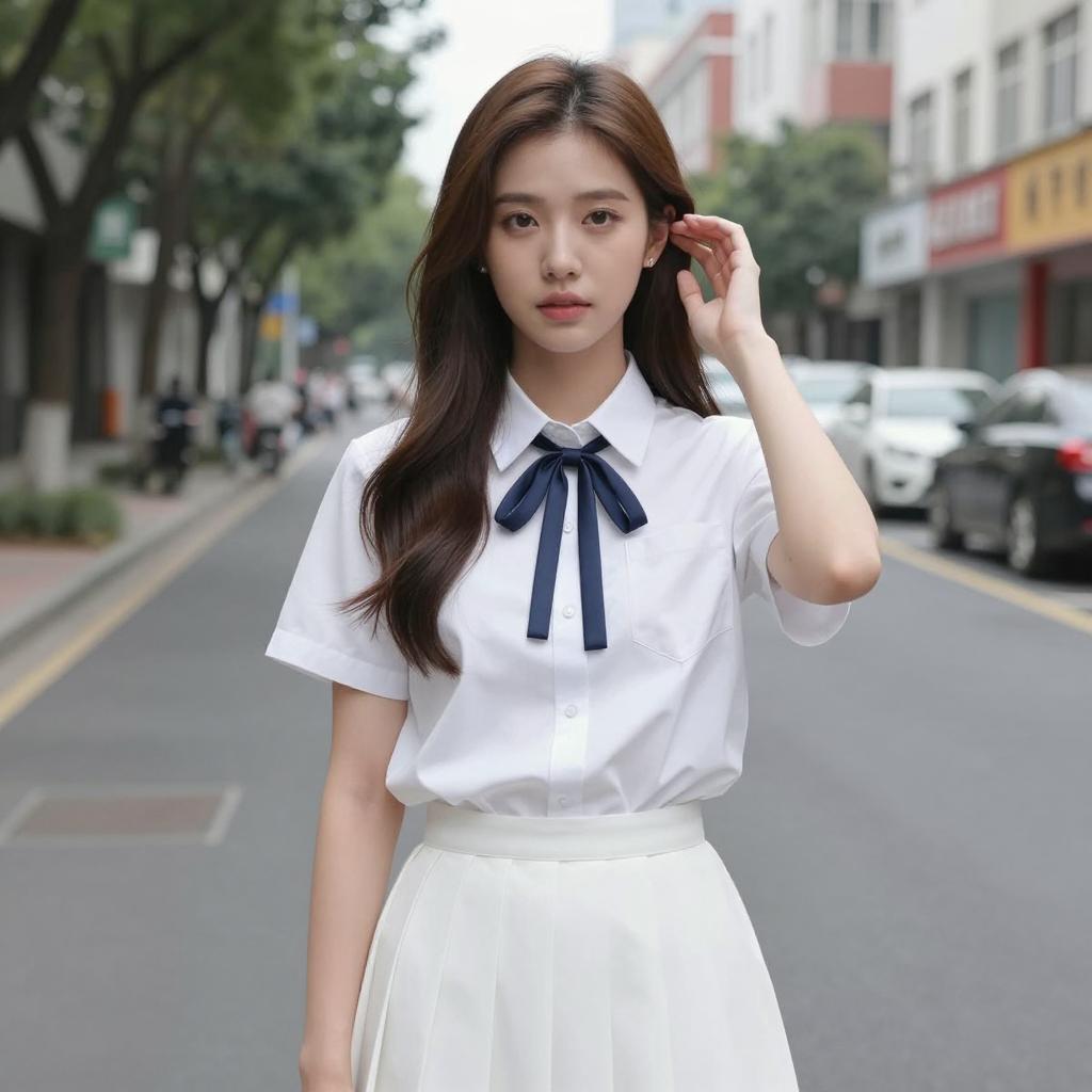 A young woman posing in front of a modern cityscape with towering skyscrapers including a very tall iconic building, on a sunny day with blue sky and some clouds, standing on a balcony with intricate patterns and warm tan stone, wearing casual summer clothes, bright natural lighting, vibrant urban atmosphere