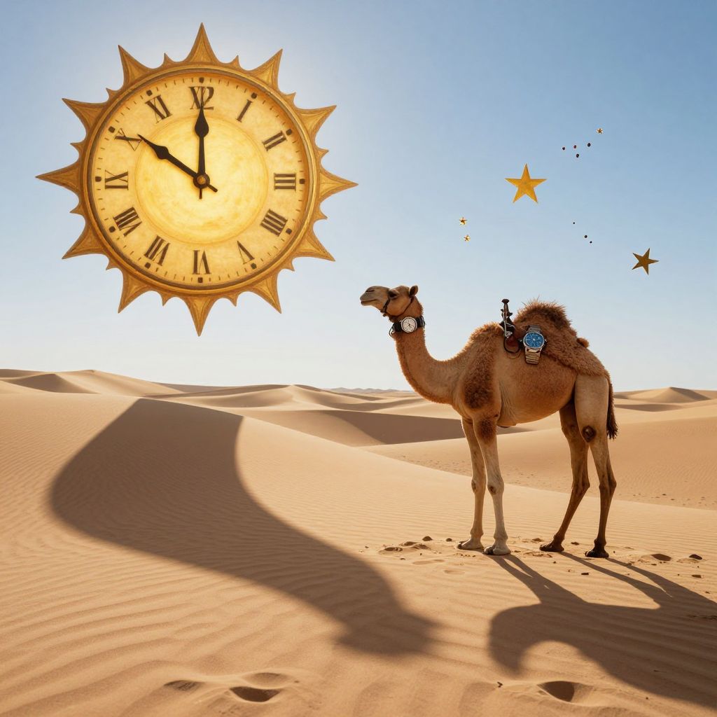 Photograph-like digital illustration of a desert scene featuring a camel with a saddle bag and a blue emblem on its back, standing on golden sand dunes under a bright, oversized sun clock with Roman numerals. The sun clock has a spiky, sunburst design and casts a long shadow across the sand. Several yellow stars are scattered in the clear, blue sky. The camel's shadow is prominent on the right, adding depth to the image. The overall style is surreal, blending realistic desert elements with whimsical, clock-like sun.