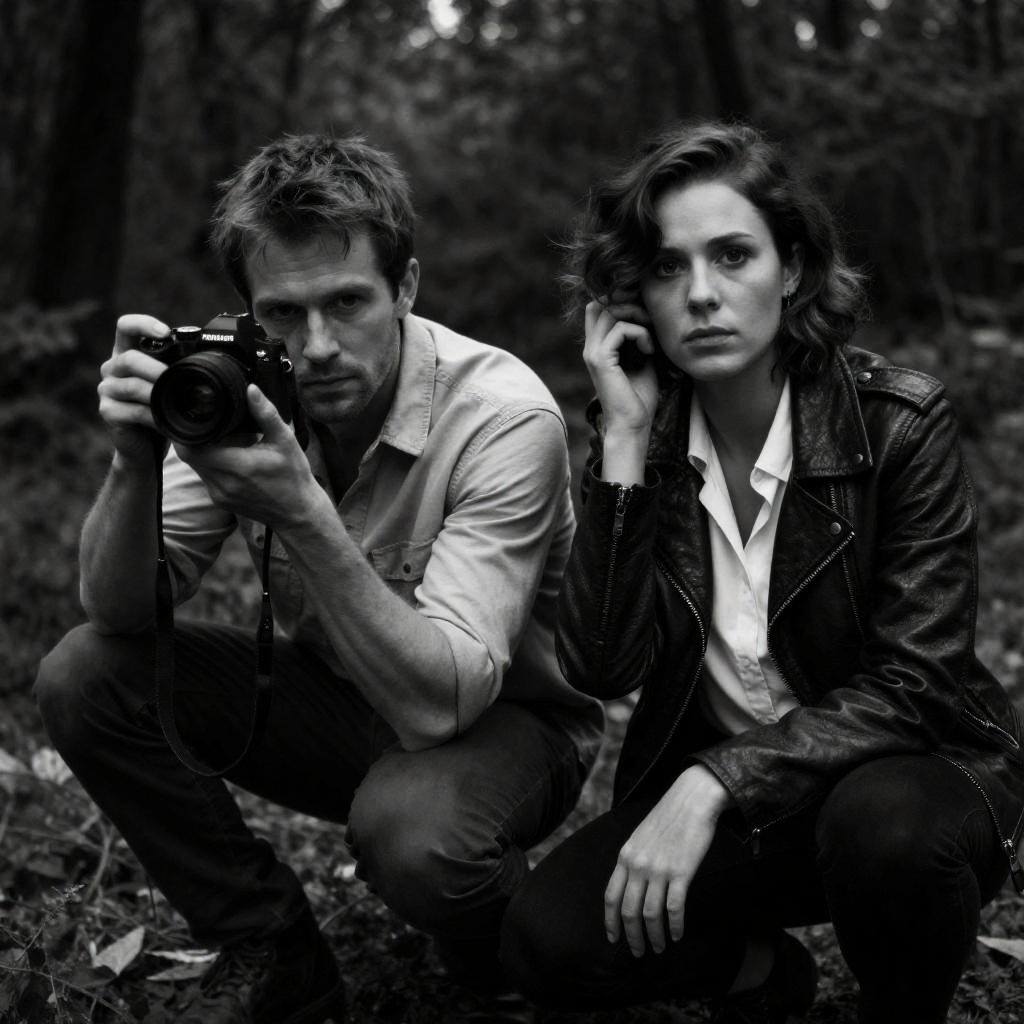 Black-and-white photograph of a man and woman in a dimly lit forest. Man with short, messy hair, intense gaze, light shirt, holding camera. Woman with short, wavy hair, serious expression, leather jacket, white shirt, holding camera to ear. Both crouching, focused, looking forward. Dense foliage in background.