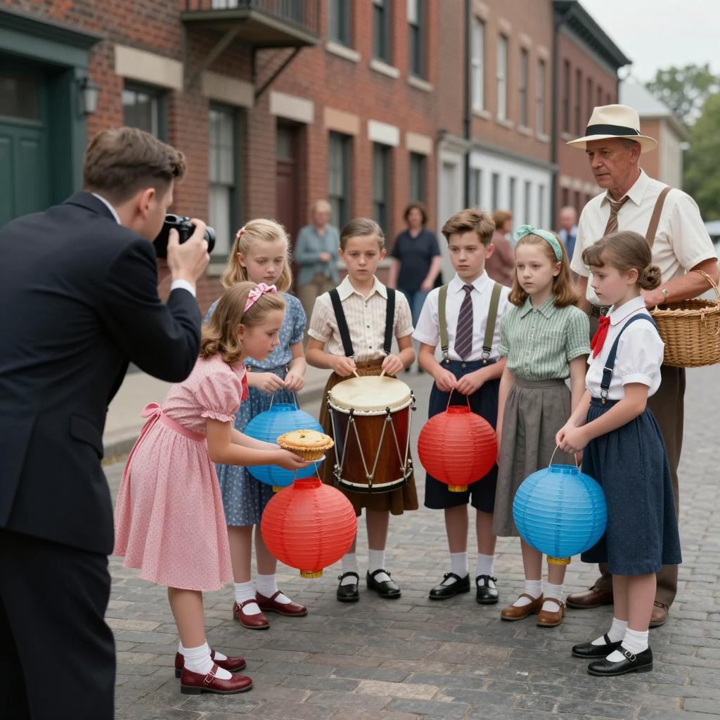A street scene. Six children, dressed in 1940s clothing, stand in a circle holding red and blue paper lanterns. One girl in pink dress bends forward, presenting a pie. A photographer in black suit takes a picture. An older man in white hat and shirt holds a basket. Drum in center. Cobblestone street, brick buildings in background. Several adults in background. Children's expressions neutral to slightly curious.