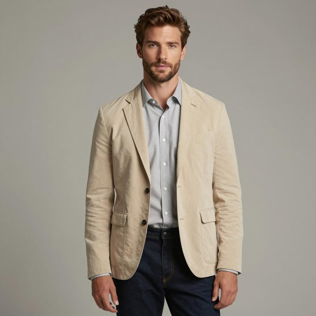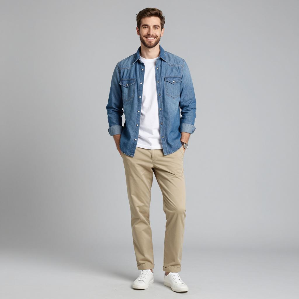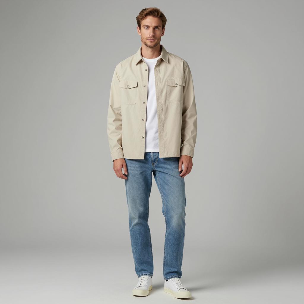 Semi casual clothes man, photograph of handsome man, standing, full body, light brown hair, slight stubble, light beige button-up shirt, white t-shirt underneath, light blue jeans, neutral gray background, casual style, slightly relaxed posture, soft lighting, realistic, studio shot, modern fashion, clean and simple, slight shadow under shirt, subtle ure in jeans
