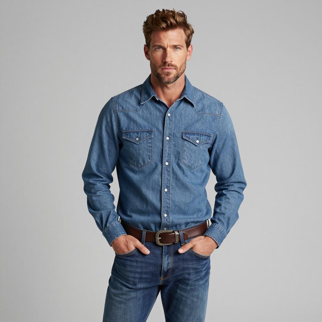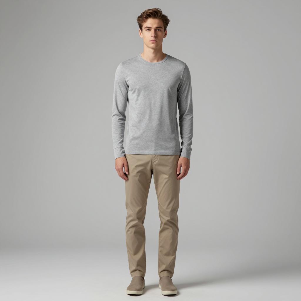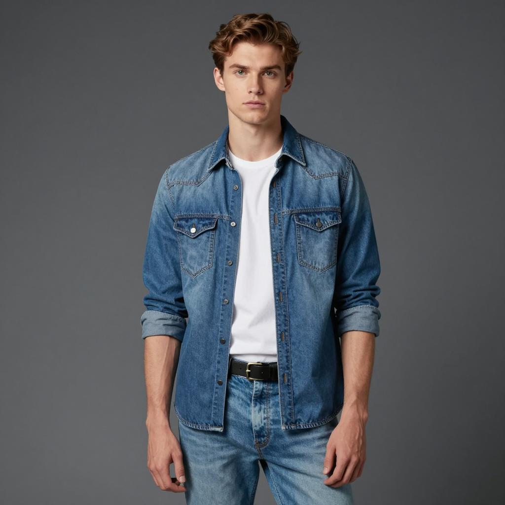 Semi casual clothes man, photograph of handsome man, standing, full body, light brown hair, slight stubble, light beige button-up shirt, white t-shirt underneath, light blue jeans, neutral gray background, casual style, slightly relaxed posture, soft lighting, realistic, studio shot, modern fashion, clean and simple, slight shadow under shirt, subtle ure in jeans