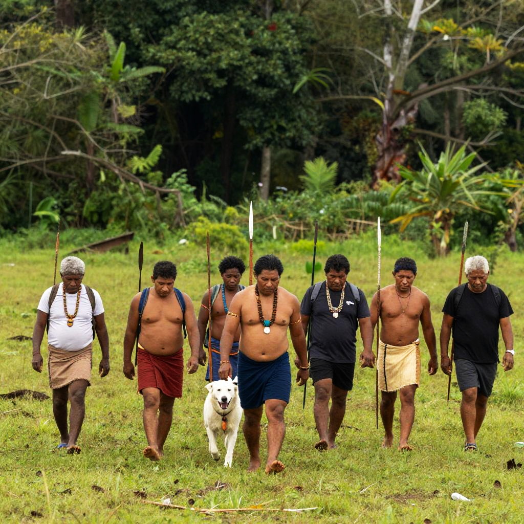Photograph of a group of Indigenous people walking through a lush, green field with a dense forest in the background. They're carrying backpacks and spears, wearing traditional attire like loincloths and shirts. A white dog walks alongside them. The group is diverse in age and size, with some people shirtless and others in dark clothing. The image has a vibrant, natural color palette.
