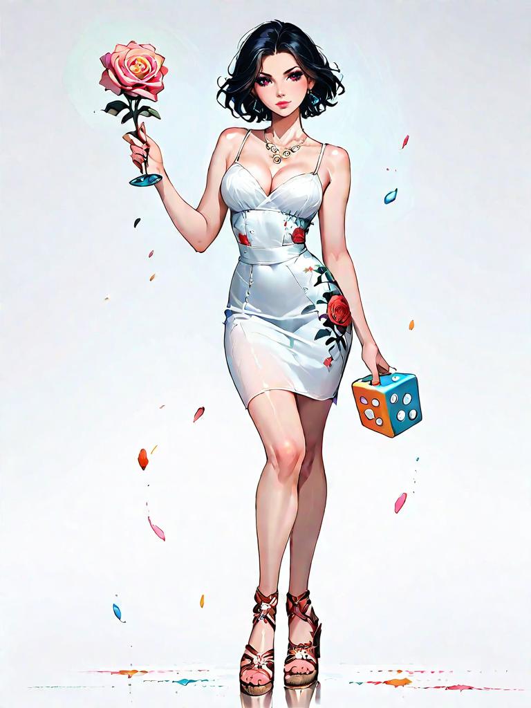 1girl, source_comics, realistic face, full body shot, Woman, romantic style, A-line gown in dusty rose, spaghetti straps, soft V-neckline, gathered bodice, floor-length with a thigh-high slit, holding a floral arrangement, simple heeled sandals, minimal jewelry with a delicate necklace, studio background in a warm peach tone.
