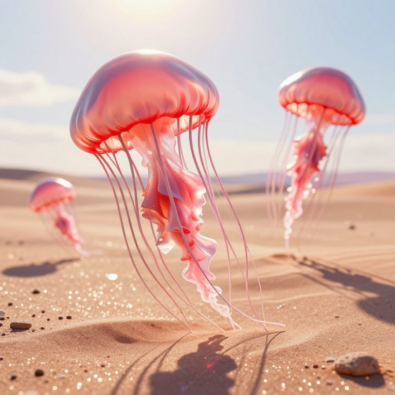 A surreal 3D-rendered scene depicts giant jellyfish with vibrant red and pink hues gliding gracefully over a shimmering desert landscape, their delicate tendrils casting ethereal shadows that dance in the golden-hour light, creating a dreamlike and otherworldly atmosphere.