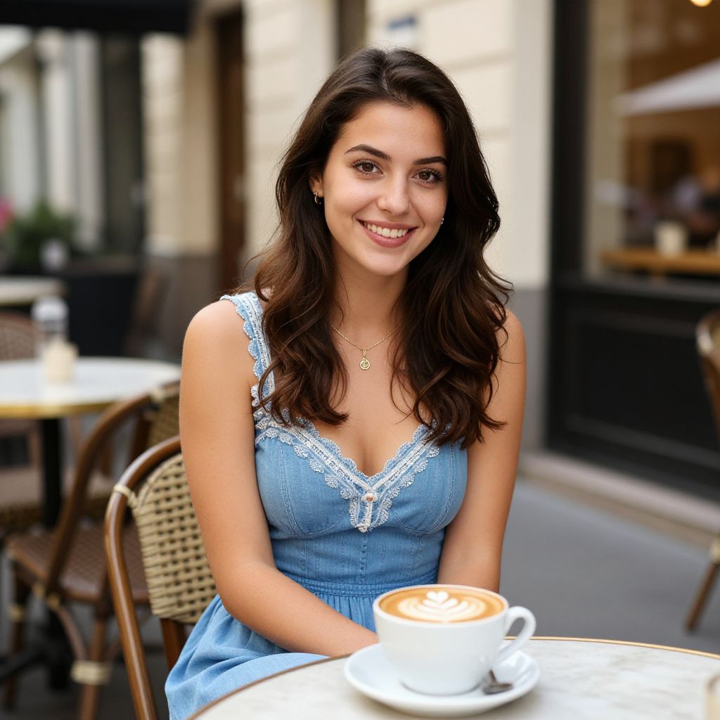 A young woman sits at a quaint outdoor café, wearing a stylish blue dress and smiling warmly at the camera. A cup of latte art rests on the table, enhancing the inviting atmosphere of the street-side setting.