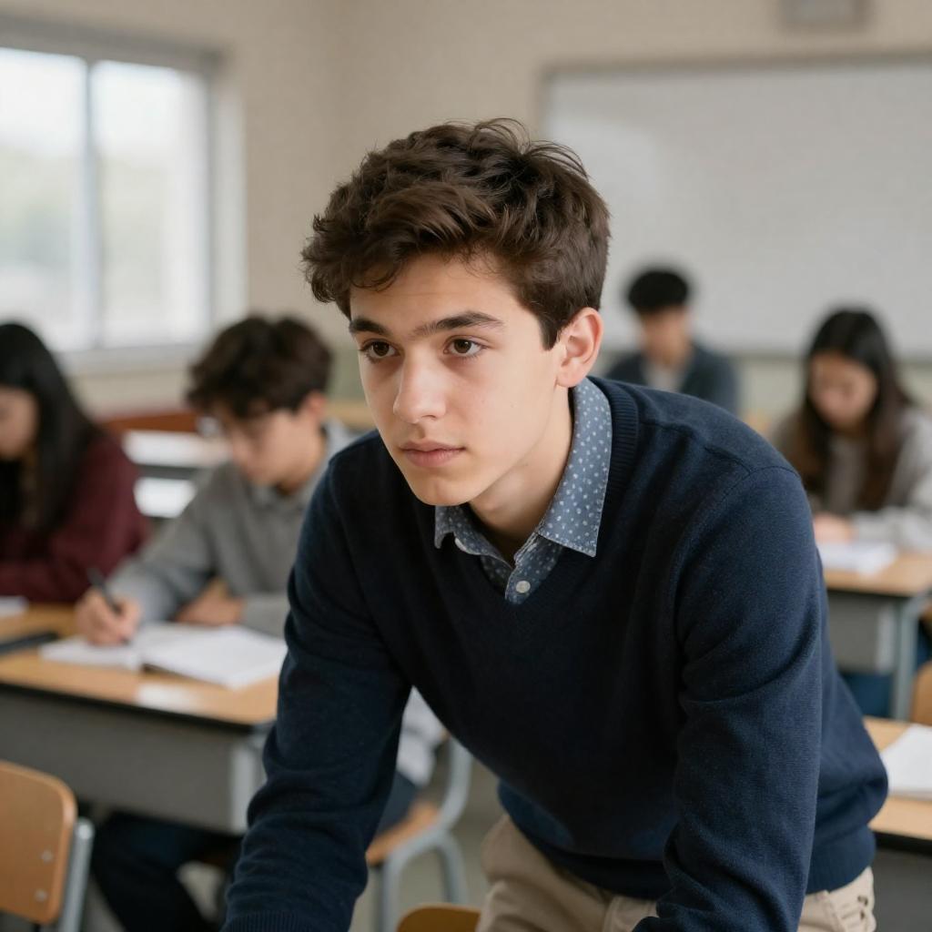 A young male student with dark brown hair wearing a navy blue sweater over a patterned shirt leans forward attentively in a classroom setting. Several other students are seated at desks in the background, engaged in writing or studying. The room features a large window allowing natural light to illuminate the space.